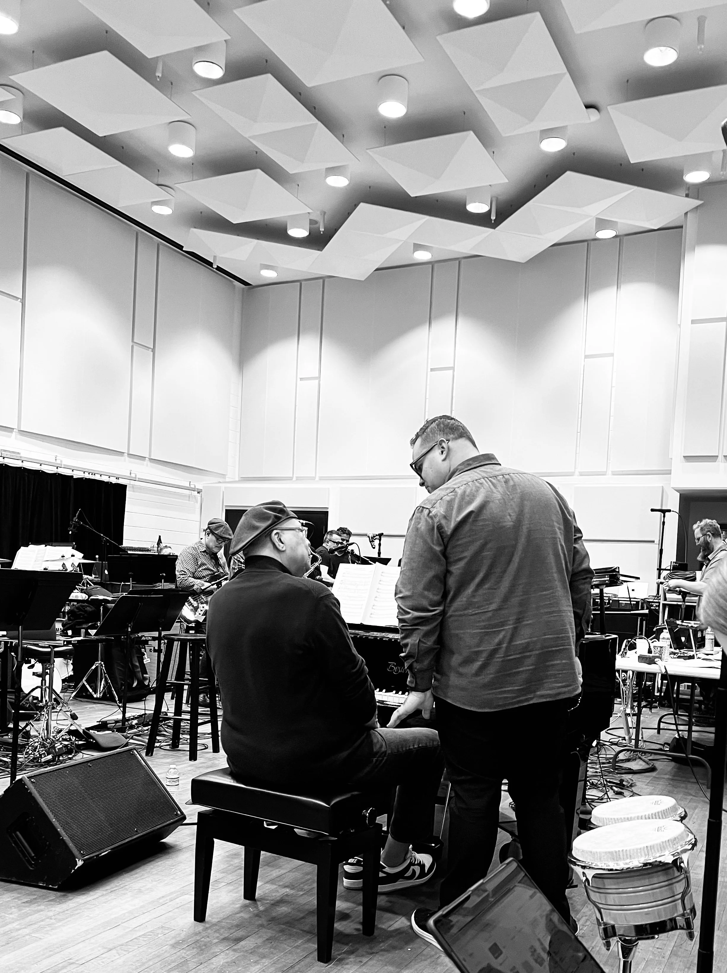 Recording at East Studios Los Angeles. From left to right: Steve Genewick, Luis Conte, Mauricio Guerrero Jr, JD Perez, Rickey Minor, Jonathan Montes, Yosmel Montejo